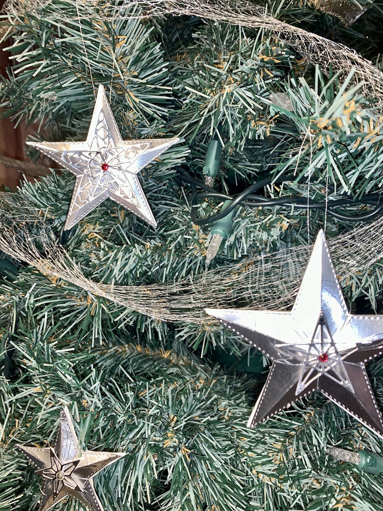 avant l'année 2021 se fait ressentir énormément. Nous avons tous hâte de tourner la page de l'année 2020... ouf! Le défi de ce mois était de créer une décoration de Noël. Mon coeur à tout de suite penser sur les magnifiques poinçons "étoiles à coudre" à la page 183 du catalogue annuel. J'aime tellement le fait que nous pouvons créer des étoiles de différentes tailles, la qualité des poinçons qui donne la possibilité d'ajouter du relief ou des détails à nos projets. Saviez-vous que ce lot comprend 23 poinçons? WOW! Je me suis donc amusé à découper des étoiles de toutes les tailles et d'en faire des ornements pour mon sapin de Noël avec les feuilles métallisées de couleur argent.